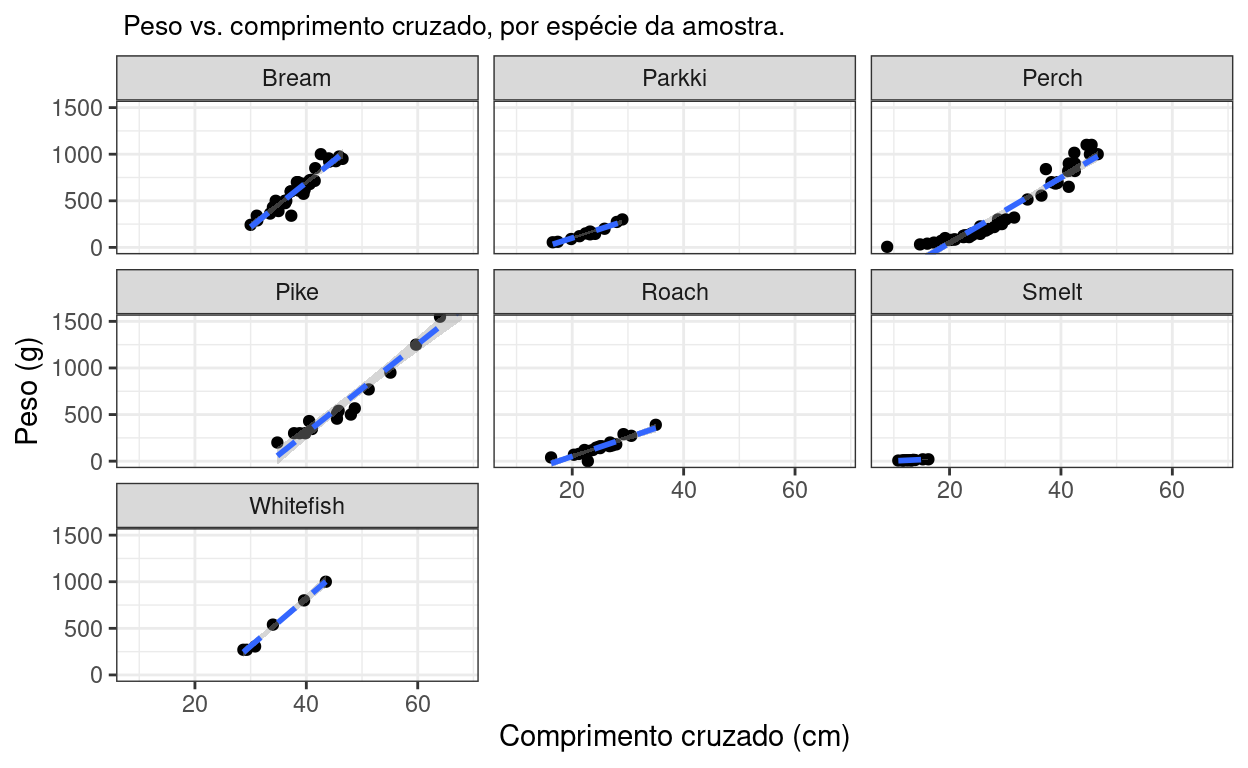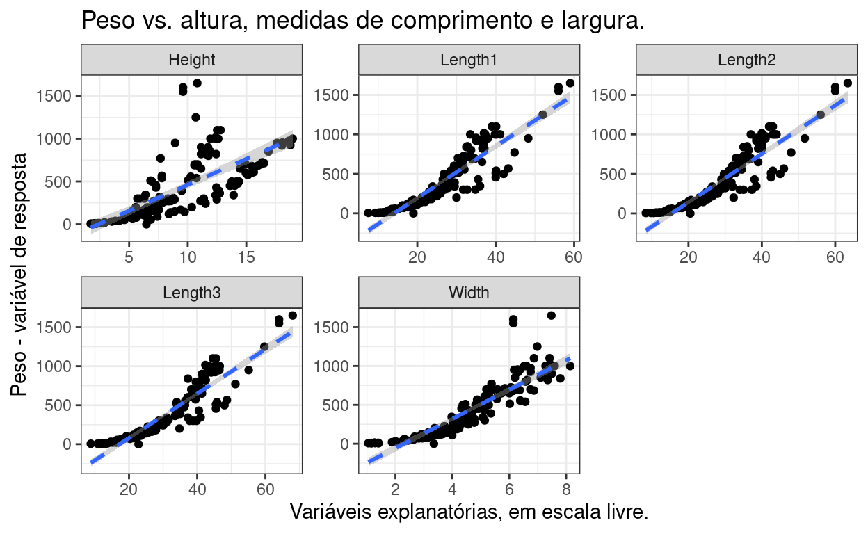 As três medidas de comprimento são as que melhor descrevem o comportamento do peso. A altura é a medida menos robusta e a largura fica no meio do caminho. Os valores altos dos modelos que levam em consideração os diferentes tipos de comprimento apontam para uma possível colinearidade entre essas variáveis. Isso significa que, em um modelo multivariado, essas medidas provavelmente seriam redundantes.