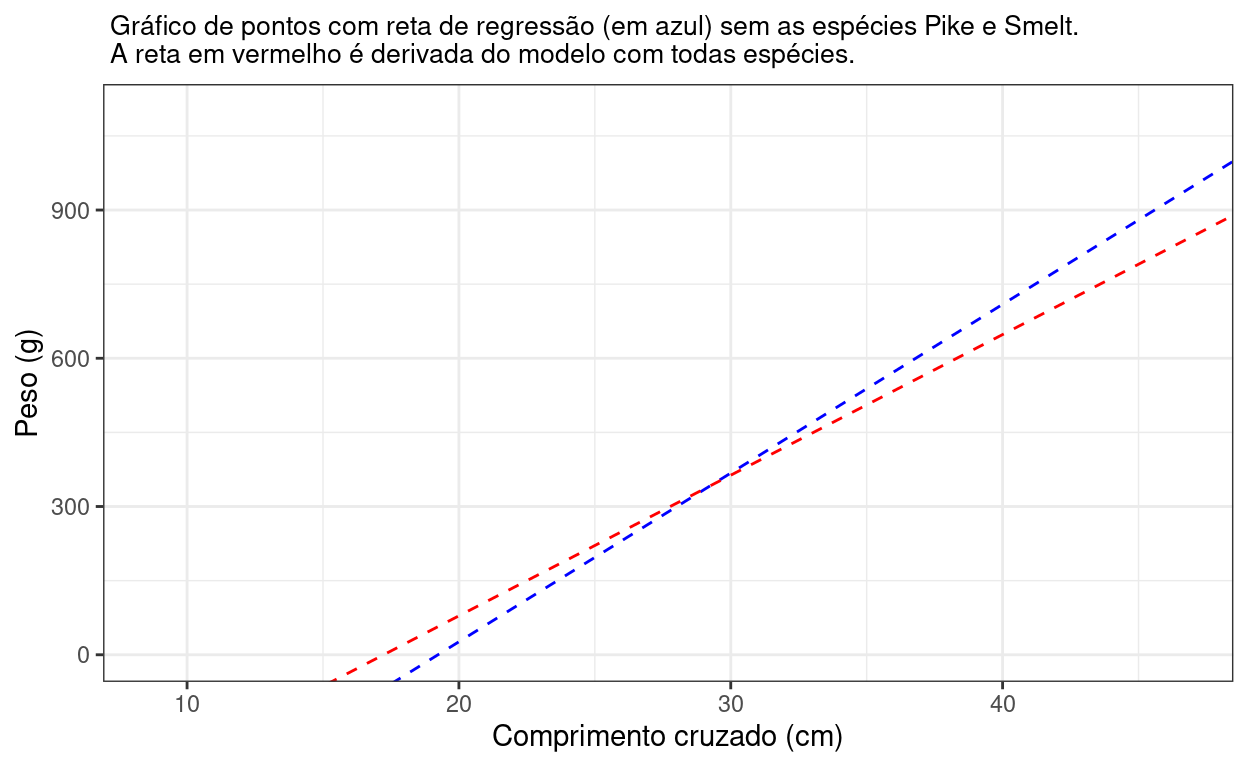 Visualizando dessa forma fica mais claro o comportamento da nova reta em comparação com a reta associada ao primeiro modelo (tracejada vermelha). Essa inclinação indica uma correlação mais forte entre as variáveis na ausência das espécies Pike e Smelt, fato reforçado quando se calcula os índices de pearson para os dois casos: