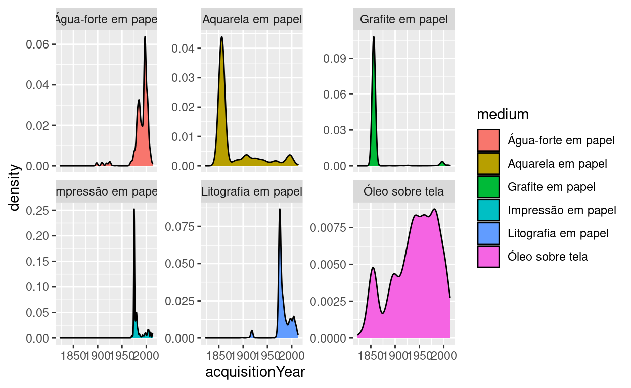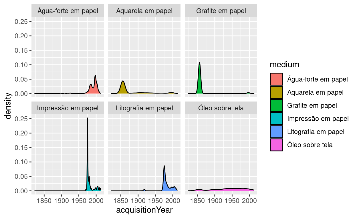 A ideia aqui não é analisar os dados, mas algumas conclusões superficiais podem ser extraídas do gráfico, como por exemplo o fato de que as obras de grafite e aquarela em papel possuem datas de aquisição mais antigas ou que o contrário ocorre, no caso das obras de água forte ou litografia em papel.