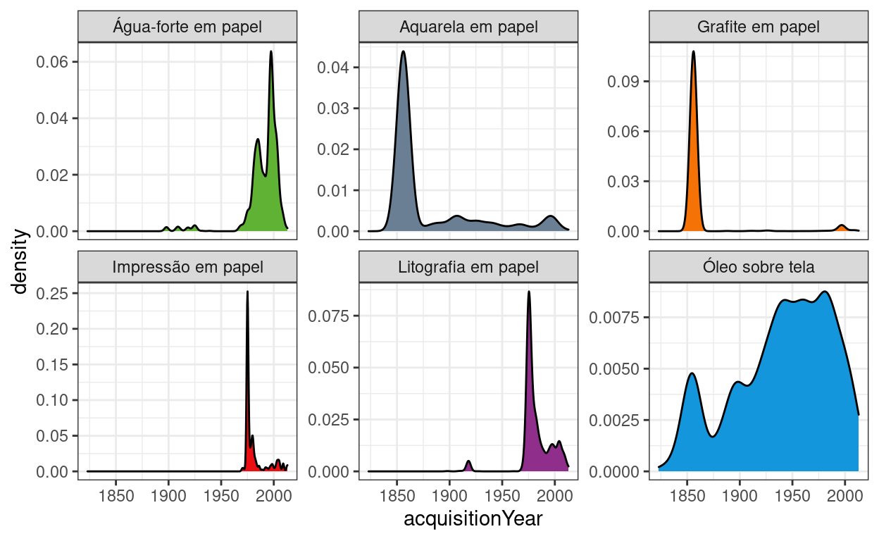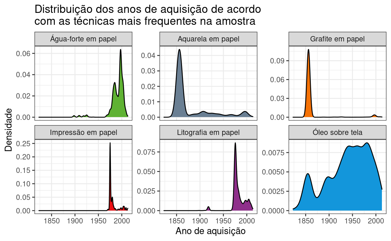 Agora já posso começar a trabalhar no gráfico. Quero plotar a densidade dos valores de ano de aquisição, agrupando os dados por tipo de técnica e atribuindo uma cor para cada: